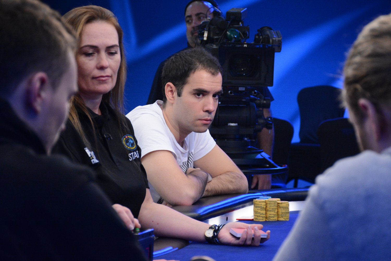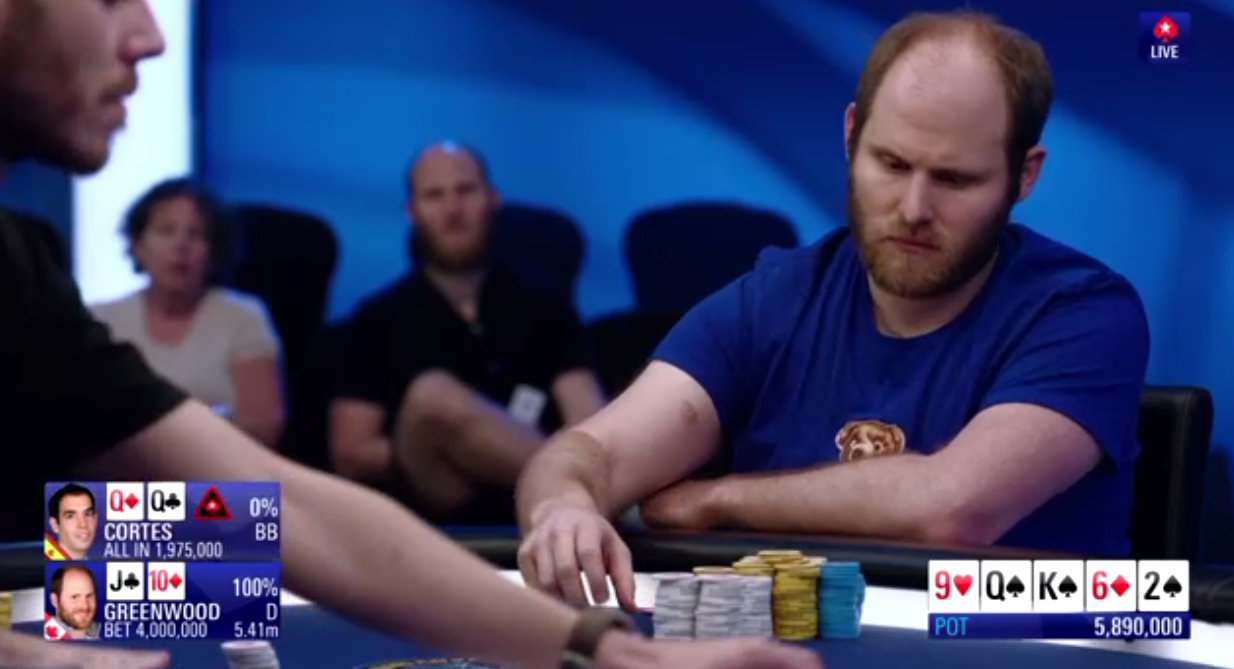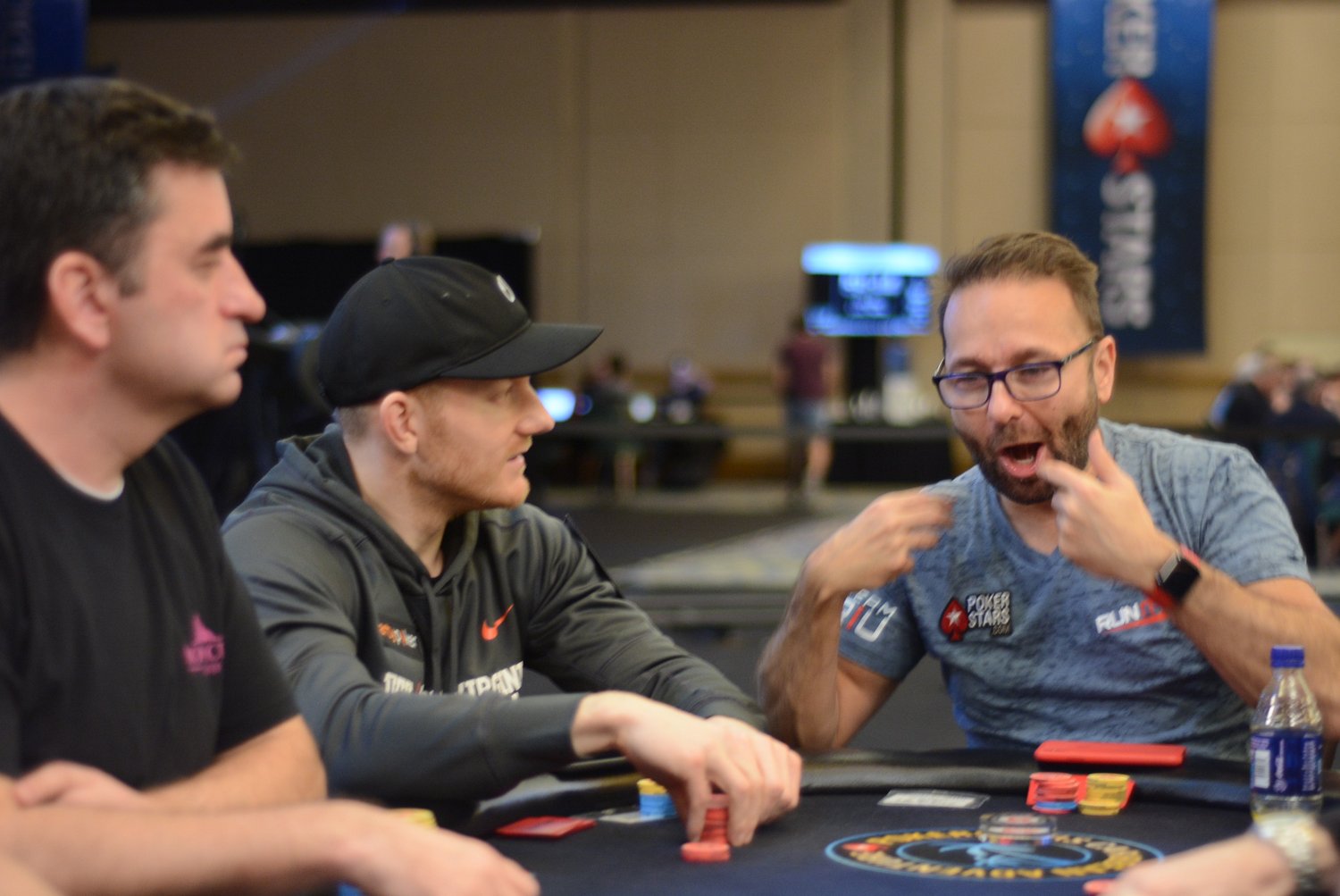 On le voit, Mustapha Kanit a vécu un très bon Day 1. Entamé en table TV (rendez-vous sur la chaîne Twitch de PS pour suivre en quasi-direct), son Day 2 se pass pour le moment de façon similaire : notre moustachu préféré a réussi un très joli bluff contre Isaac Haxton (à droite sur la photo), avec un check/raise all-in en semi-bluff sur un board 8