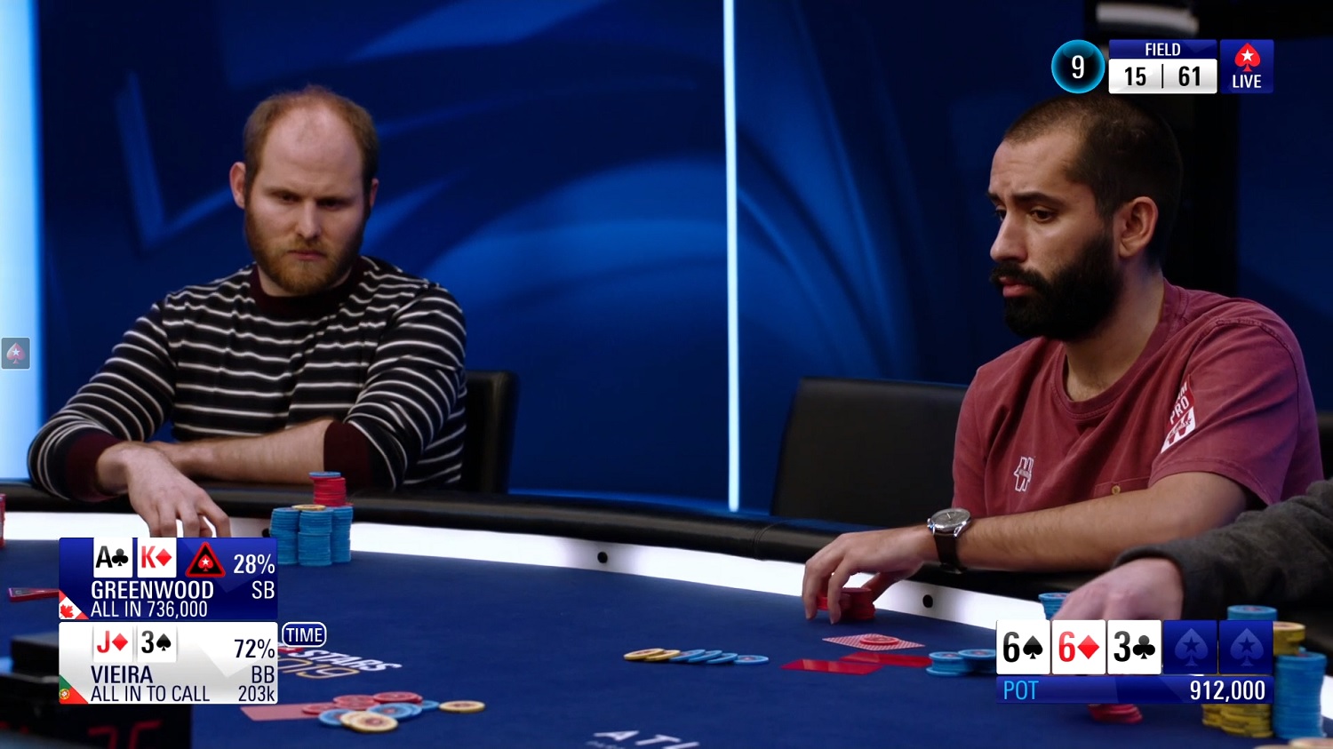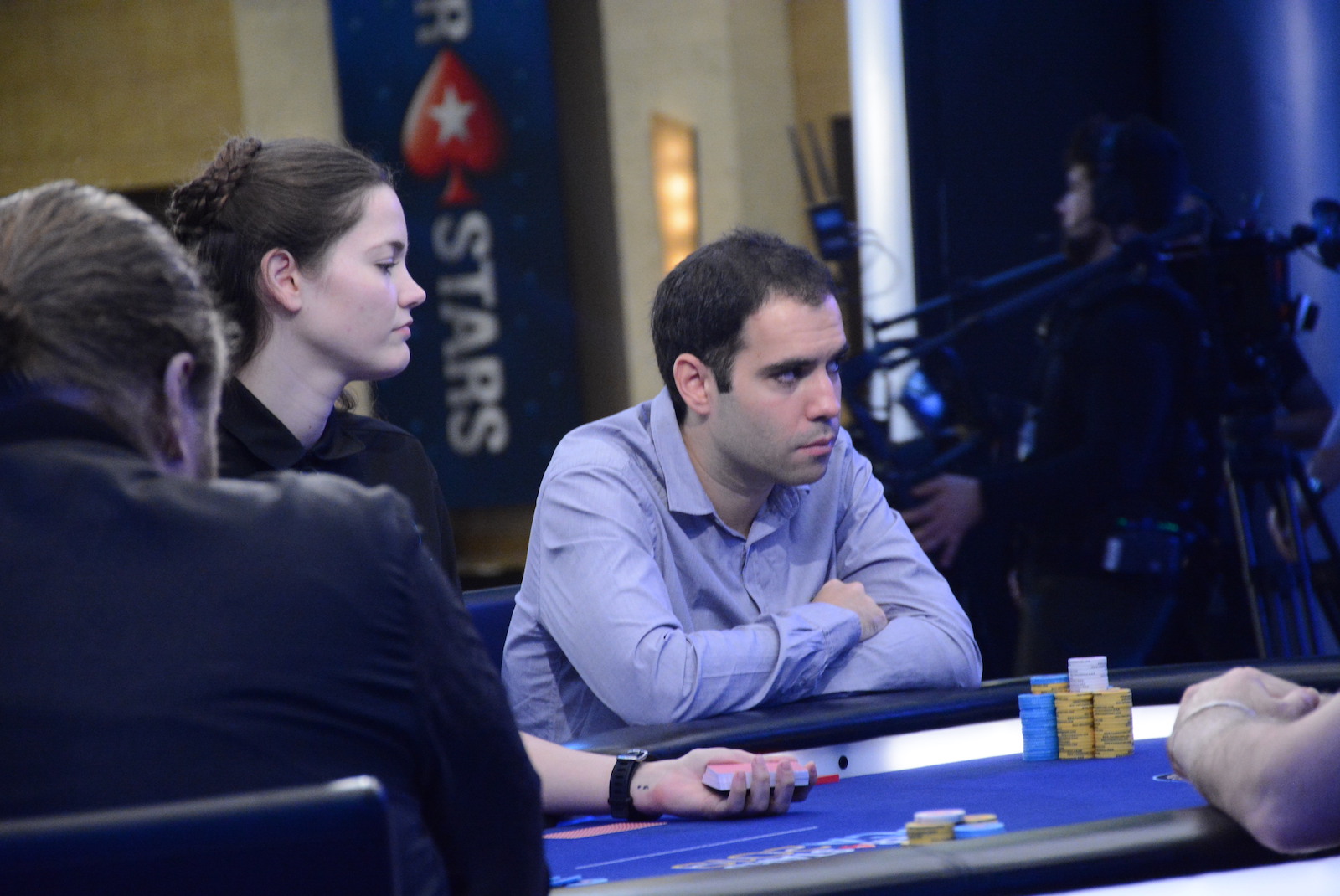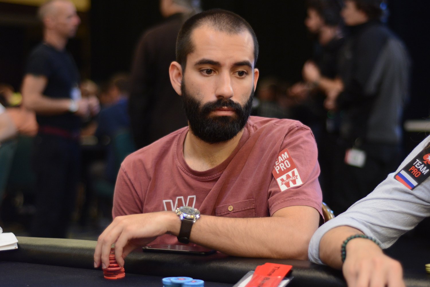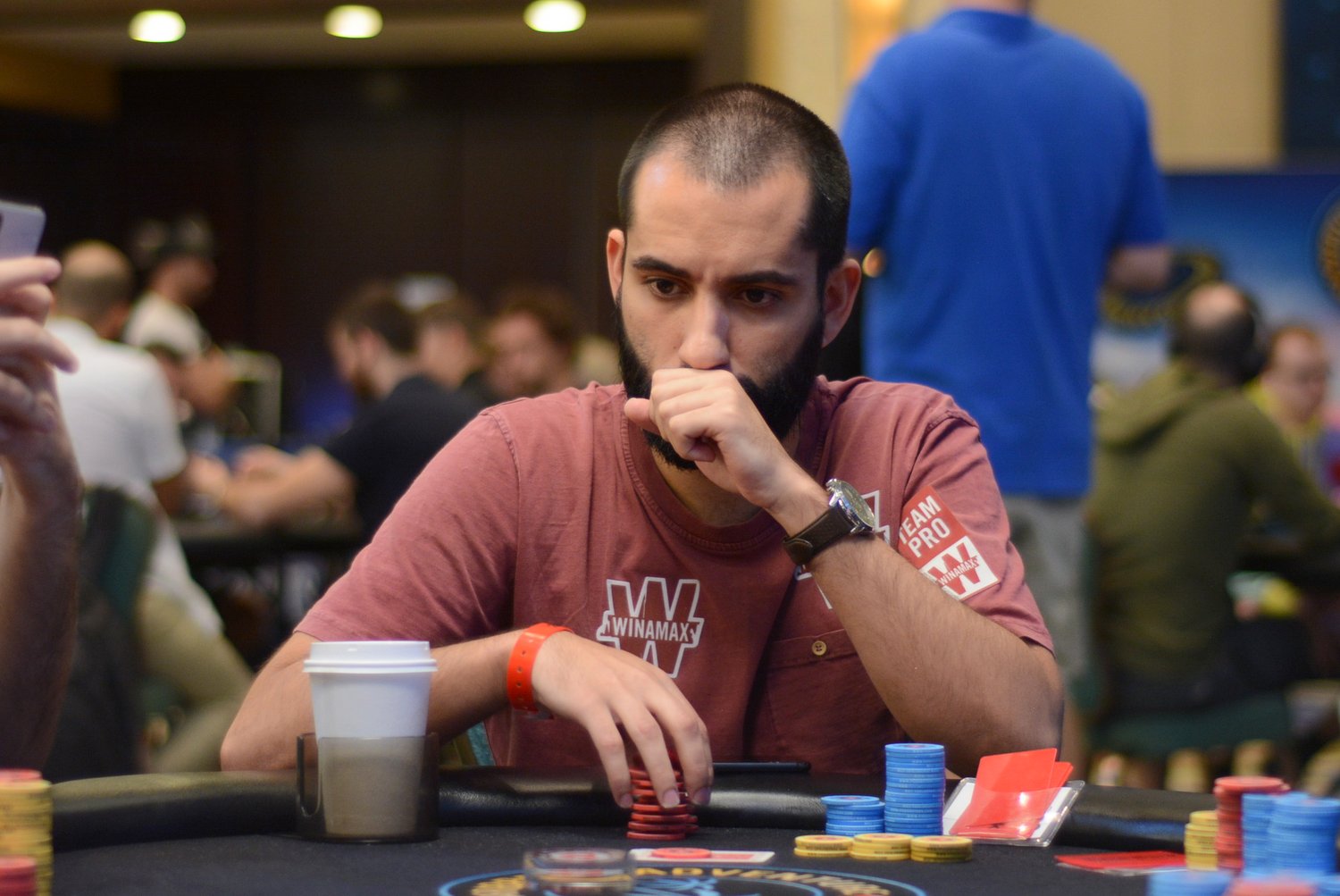 On le voit, Mustapha Kanit a vécu un très bon Day 1. Entamé en table TV (rendez-vous sur la chaîne Twitch de PS pour suivre en quasi-direct), son Day 2 se pass pour le moment de façon similaire : notre moustachu préféré a réussi un très joli bluff contre Isaac Haxton (à droite sur la photo), avec un check/raise all-in en semi-bluff sur un board 8