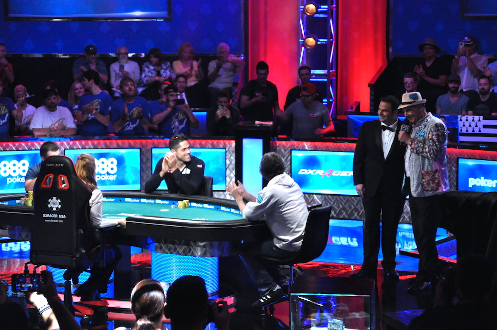 , carte sur laquelle Blumstein va annoncer tapis. Il couvre Ott, à qui il reste 85,775 millions de jetons. Ce dernier réfléchit pendant une bonne minute, avant de rendre ses cartes au croupier. Explosion de joie du côté de Blumstein, qui passe à 232,95 millions. Le compteur est remis à zéro pour Ott, ce pot lui fait perdre tout le bénéfice accumulé aujourd’hui. Les mains ? K