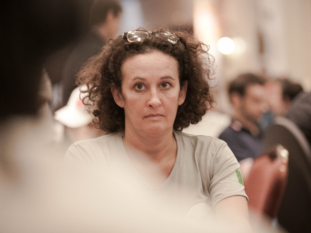 Parmi ses adversaires du jour, un certain Bernard Mendy, à qui elle a déjà donné quelques jetons. Dans un pot d'une cinquantaine de blindes (ce qui ne représente que 2500 jetons en début de tournoi), l'ancien défenseur du Paris Saint-Germain a révélé TT à l'issue d'un tableau 945J6 où quelques sacochettes ont été envoyées. Un tirage raté en main, Corinne n'a pu que gentiment remettre sa main au croupier lors du showdown.
