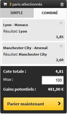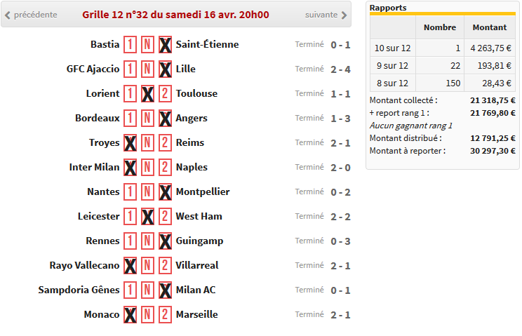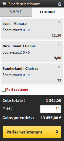 | Mise : 20 € - Cote globale : 76,31 | Gains potentiels : 1 526,13 € |