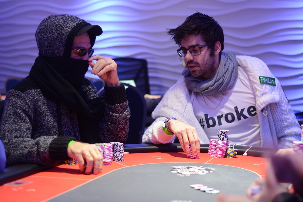Capital sensiblement équivalent du côté de Tigdhi Jacob, l'homme complètement cagoulé de la table 31 - ici en pleine discussion avec Johan Guilbert. Le secret de la réussite pour ce vieux de la vieille des cercles parisiens ? Des ouvertures à hauteur de six, voire même parfois sept fois la grosse blinde. De petites facéties qui ne font même plus dresser les sourcils de ses voisins, désormais habitués. Ou résignés, c'est selon.